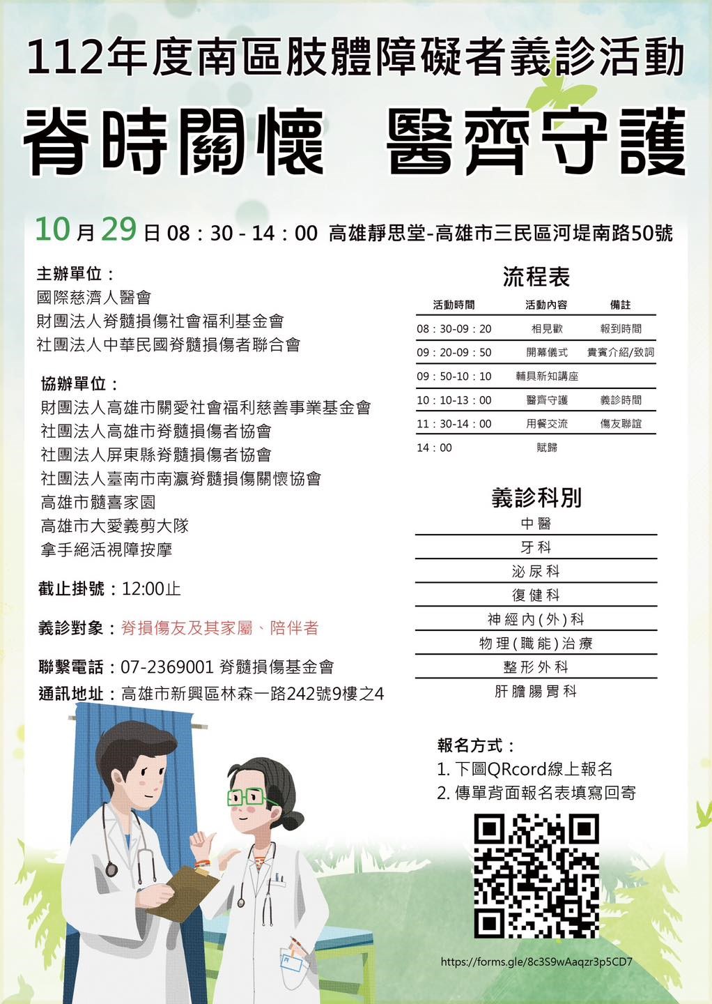 112.10.29脊損基金會x慈濟人醫會在高雄靜思堂有辦義診活動,歡迎報名參加!